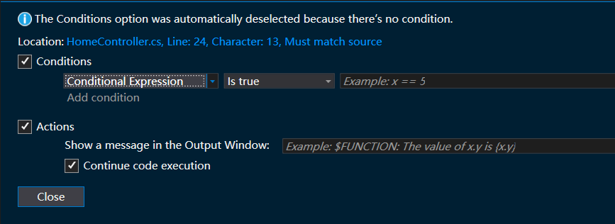 这个就有意思了,在断点上右键是弹出编辑面板,点击左键是关闭断点,问题就出在这里,经常由于手贱,本想点右键结果点了左键 😨😨😨。。。。 好不容易设置好的条件没了。。。真的没了😭😭😭,从此以后,路转黑。如下图: