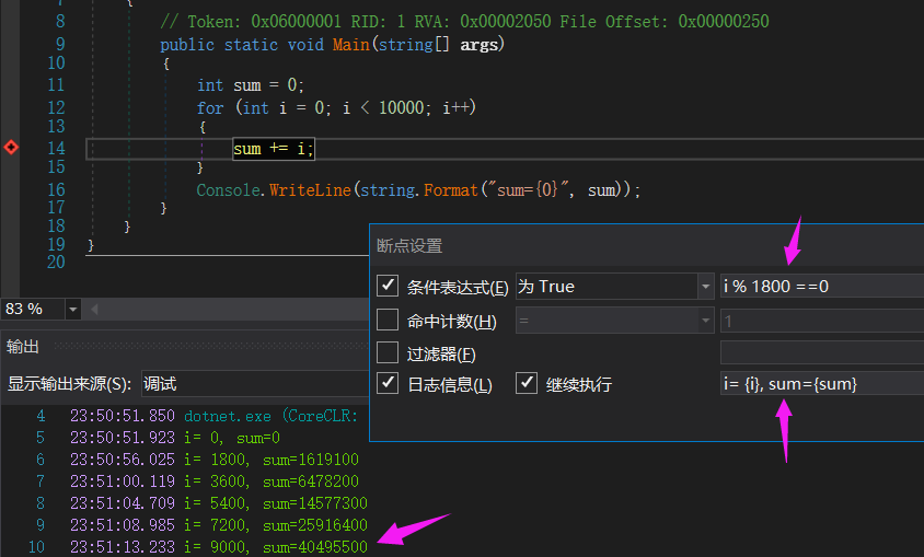 这里就可以用到 action 断点的日志记录,在 for 循环迭代中,不需要中断断点,只需记录某一个特定状态下当前的 i 和 sum 的值,对调试代码非常有帮助,如下图: