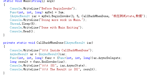 在回调方法内,我们的代码应该调用委托的endinvoke方法来处理异步方法执行后的输出值。要调用委托的endinvoke方法,我们肯定需 要委托对象的引用,而它在初始线程中,不在开启线程中。如果我们不使用begininvoke的state参数作其它的用途,可以使用它发送委托的引用给 回调方法。否则,我们可以从发送给方法作为参数的iasyncresult对象中提取出委托的引用。