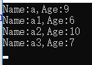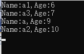 console.writeline("name:{0},age:{1}", item.name, item.age);