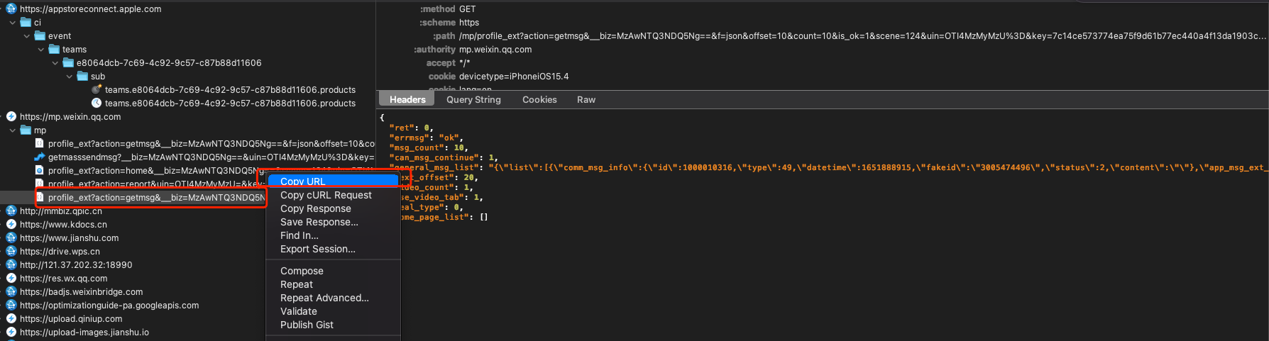 PS: 抓包复制出来的地址有效期大概五分钟左右。不过一般也够用,如果发现获取文章列表失败时,重复以上步骤即可。