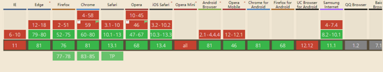 因为 css3 的新增特性一直存在兼容问题,这里查询了一下它的兼容性,看到红色区域还是不算太惨淡,出来 ie,其他浏览器基本都支持了。