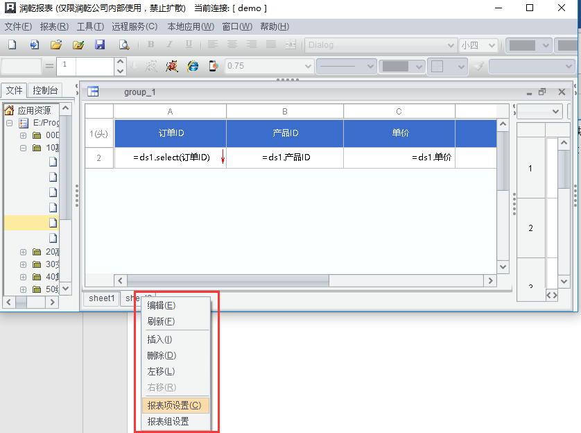 如上面截图的效果,首先分别定义订单.rpx 和订单明细.rpx 两张报表,然后在文件菜单中有新建报表组的选项。