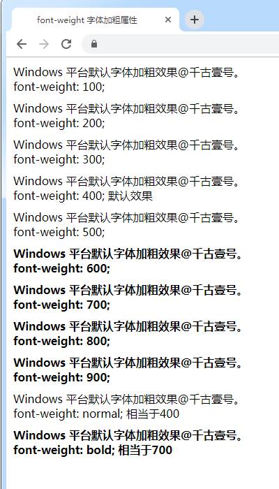 font-weight 属性:在设置字体是否加粗时,属性值既可以直接填写 100 至 900 这样的数字,也可以填写normal、bold这样的单词。normal的值相当于 400,bold的值相当于 700。如下: