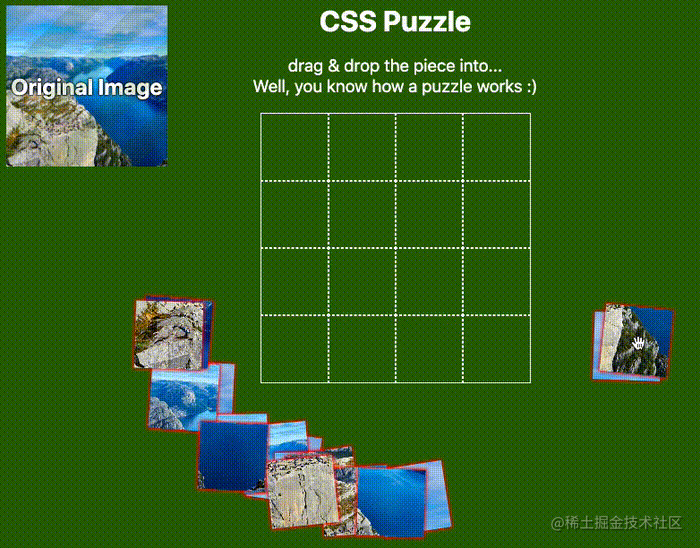 掌握了上述的原理后,上述的拼图游戏的就迎刃而解了。感兴趣的可以去看看它的源码:CSS Only Puzzle game。剩下的大部分工作在于,将完整的图片切割成不同份数,随机放置不同到不同的位置。