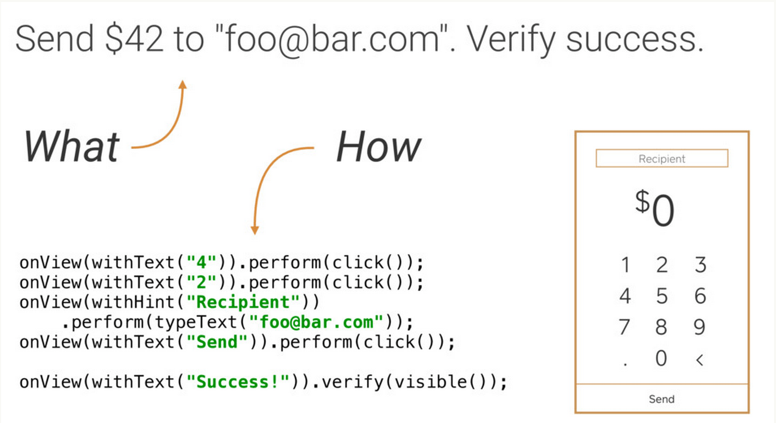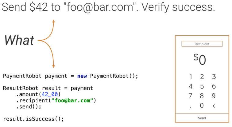 假如我们需要测试: 发送 $42 到 “foo@bar.com”,然后验证是否成功。