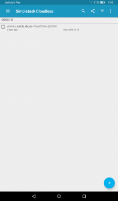 对于更多以文本为中心的用户,Simpletask Cloudless 使用?todo.txt?格式创建条目。列表是通过用?@符号为任务中的单词加前缀而创建的,并且通过使用?+?符号作为前缀来创建标签。到期日期设置为使用?due: YYYY-MM-DD。因为底层数据存储在一个简单的文本文件中,与其他?todo.txt 兼容的应用程序共享任务列表是很容易的。