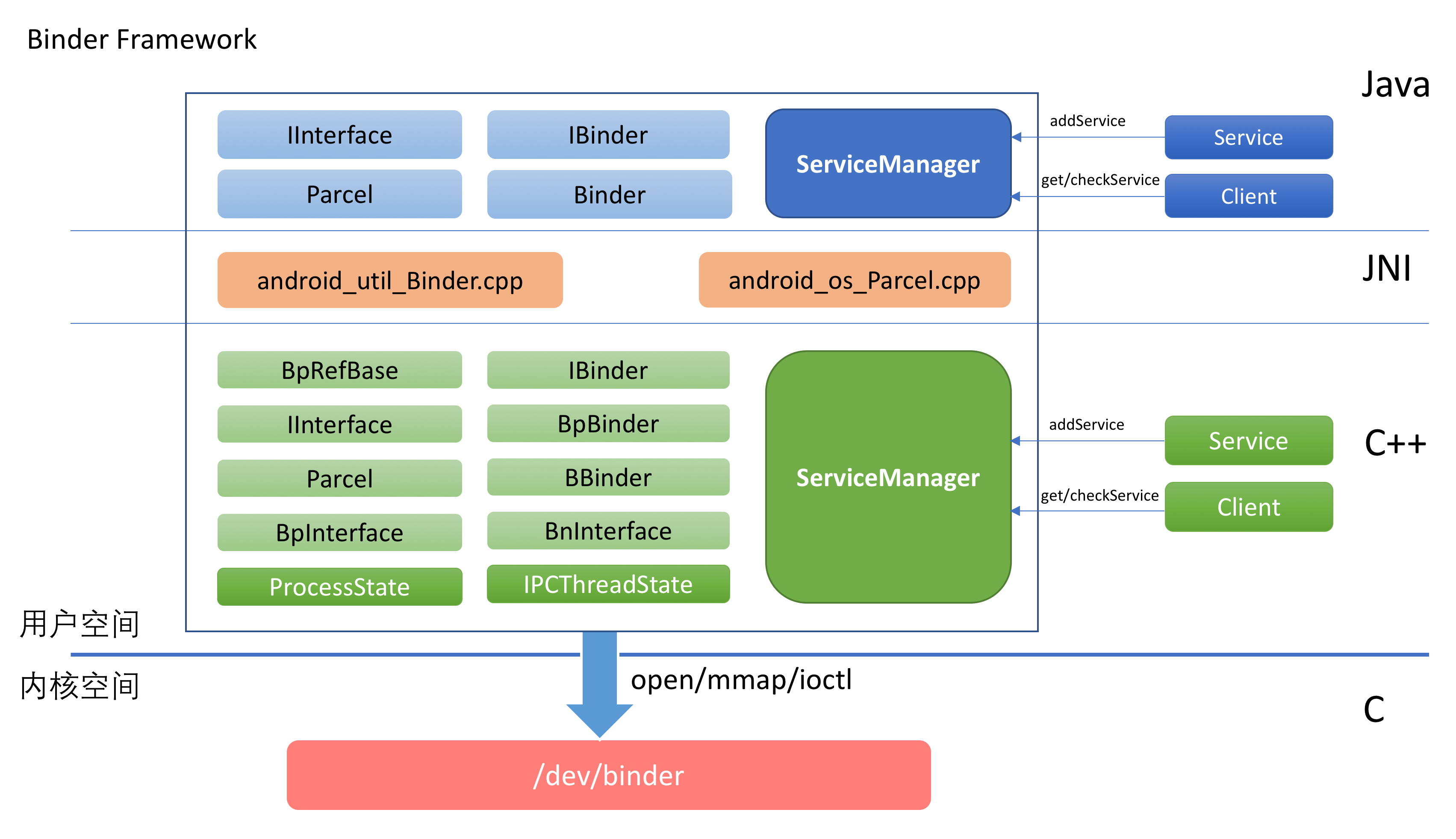 下文会以自下而上的方式来讲解Binder框架。自下而上未必是最好的方法,每个人的思考方式不一样,如果你更喜欢自上而下的理解,你也按这样的顺序来阅读。