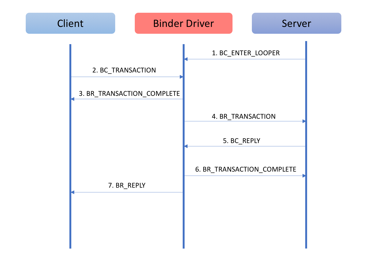 - 进程通过BC_REGISTER_LOOPER命令告知驱动其子线程(非主线程)已经ready