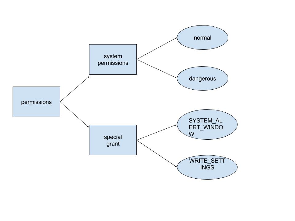 - 明白权限类型,分为normal和dangerous类型,同时,在dangerous中还需要注意一点,SYSTEM_ALERT_WINDOW 和?WRITE_SETTINGS这两个特殊授权请求方式,跟一般授权请求方式不同。