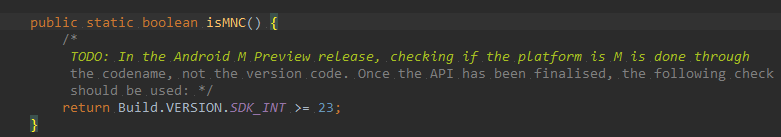 之前在工作中,碰到一种情况,如果是运行在6.0的版本上是需要走新的权限模型,如果是运行在老的版本上,则需要进行一个判断,此时碰到一个问题是,在谷歌官方推荐中,在判断app运行的系统是否在Android?M上时,它的判断是如下: ?Build.VERSION.CODENAME.equals(“MNC”); 可是在我实际适配中,发现这句却无效的,就改用Build.VERSION.SDK_INT?>=?23。