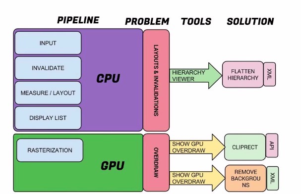 渲染操作通常依赖于两个核心组件:CPU与GPU。CPU负责包括Measure,Layout,Record,Execute的计算操作,GPU负责Rasterization(栅格化)操作。CPU通常存在的问题的原因是存在非必需的视图组件,它不仅仅会带来重复的计算操作,而且还会占用额外的GPU资源。