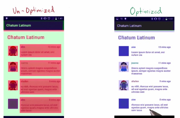 这里举了一个例子,通过XML文件可以看到有好几处非必需的background。通过把XML中非必需的background移除之后,可以显著减少布局的过度绘制。其中一个比较有意思的地方是:针对ListView中的Avatar ImageView的设置,在getView的代码里面,判断是否获取到对应的Bitmap,在获取到Avatar的图像之后,把ImageView的Background设置为Transparent,只有当图像没有获取到的时候才设置对应的Background占位图片,这样可以避免因为给Avatar设置背景图而导致的过度渲染。