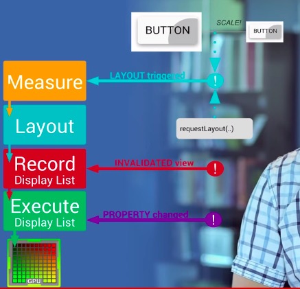 请注意:任何时候View中的绘制内容发生变化时,都会需要重新创建DisplayList,渲染DisplayList,更新到屏幕上等一系列操作。这个流程的表现性能取决于你的View的复杂程度,View的状态变化以及渲染管道的执行性能。举个例子,假设某个Button的大小需要增大到目前的两倍,在增大Button大小之前,需要通过父View重新计算并摆放其他子View的位置。修改View的大小会触发整个HierarcyView的重新计算大小的操作。如果是修改View的位置则会触发HierarchView重新计算其他View的位置。如果布局很复杂,这就会很容易导致严重的性能问题。