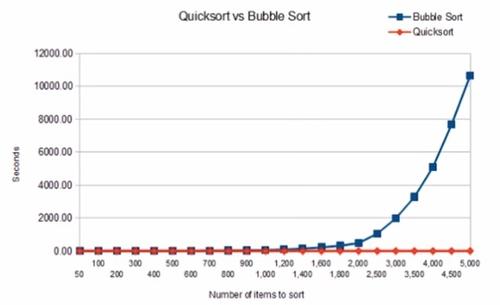 另外一个我们需要注意的运算性能问题是基础算法的合理选择,例如冒泡排序与快速排序的性能差异: