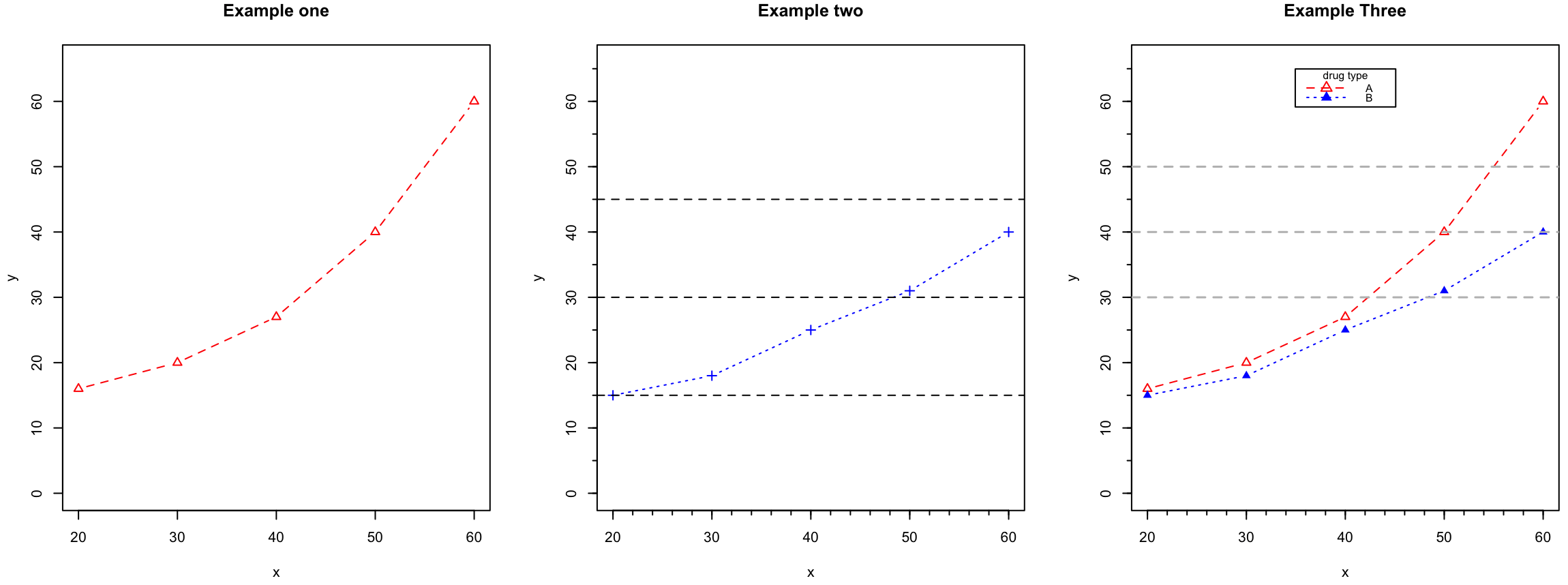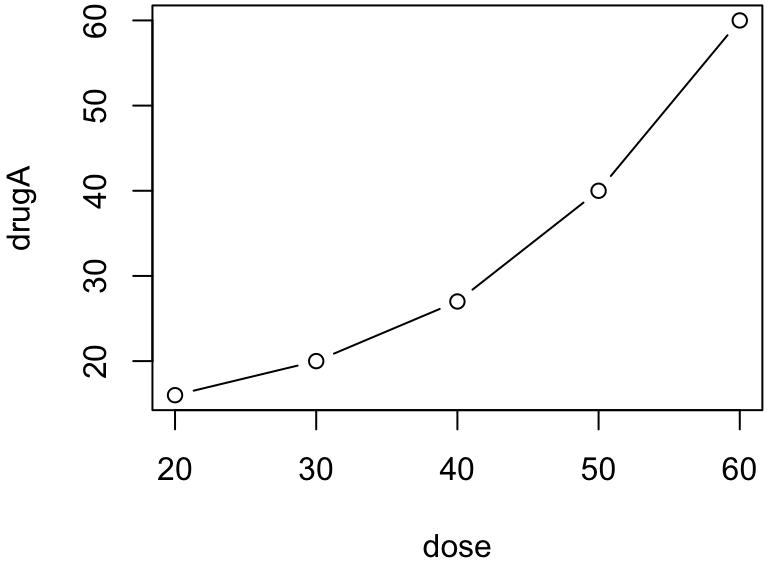 > dose = c(20, 30, 40, 50, 60) > druga= c(16, 20, 27, 40, 60) > drugb= c(15, 18, 25, 31, 40) > plot(dose, druga, type = "b")
