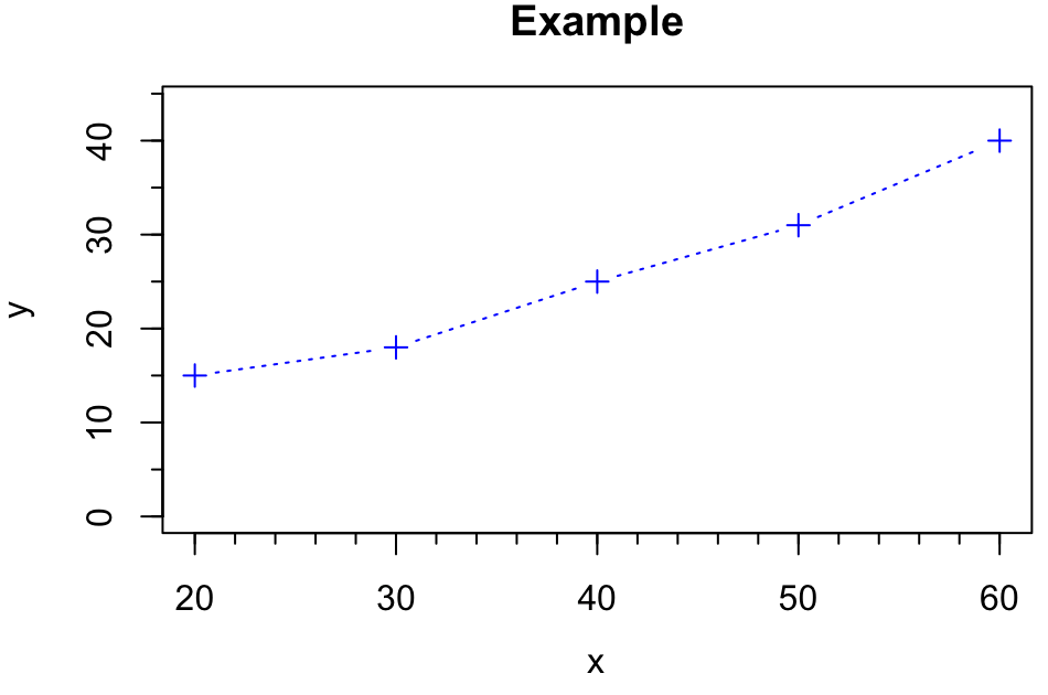 > plot(dose,drugb,type="b",pch=3,lty=3,col="blue",ylim=c(0,max(drugb)*1.1), + xlab="x",ylab="y",main="example") > minor.tick(nx=5,ny=2,tick.ratio=0.5)#添加次要刻度线