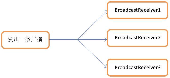 标准广播(normal broadcasts)是一种完全异步执行的广播,在广播发出之后,所有的BroadcastReceiver几乎都会在同一时刻接收到收到这条广播消息,因此它们之间没有任何先后顺序可言。这种广播的效率会比较高,但同时也意味着它是无法被截断的。示意图如下: