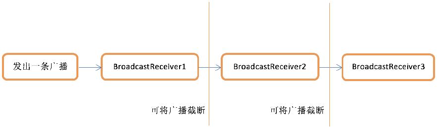 有序广播(ordered broadcasts)是一种同步执行的广播,在广播发出之后,同一时刻只会有一个BroadcastReceiver能够收到这条广播消息,当这个BroadcastReceiver中的逻辑执行完毕后,广播才会继续传递。所以此时的BroadcastReceiver是有先后顺序的,优先级高的BroadcastReceiver就可以先收到广播消息,并且前面的BroadcastReceiver还可以截断正在传递的广播,这样后面的BroadcastReceiver就无法收到广播消息了。示意图如下: