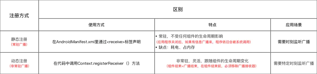 注:对于LocalBroadcastManager方式发送的应用内广播,只能通过LocalBroadcastManager动态注册,不能静态注册