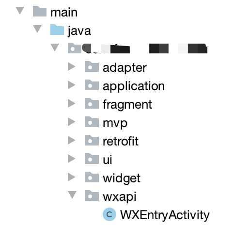 在包名目录下新建wxapi文件夹,路径名字必须和java名字必须是这两个。如图所示: