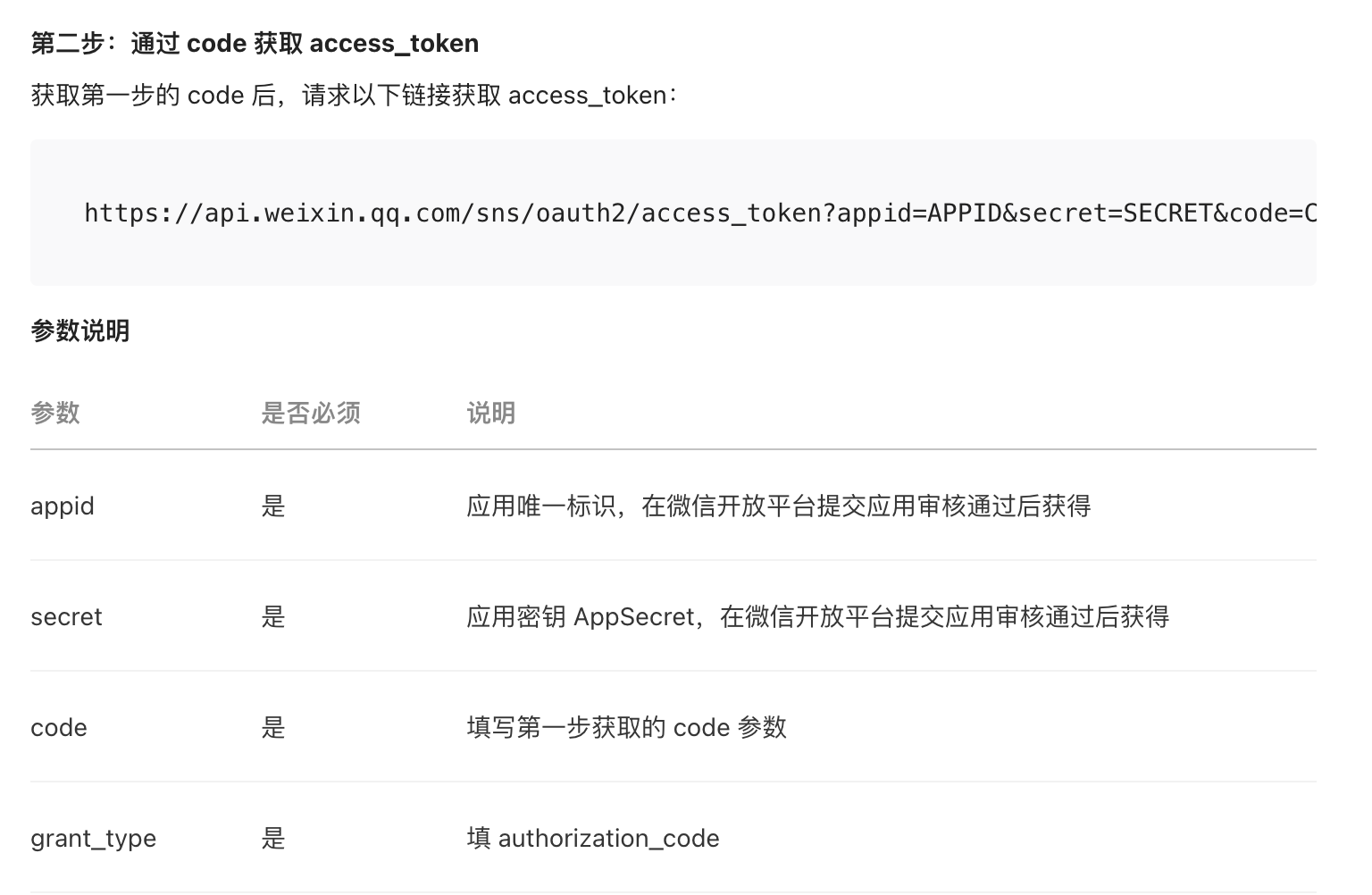 * secret:应用密钥AppSecret,在微信开放平台提交应用审核通过后获得。