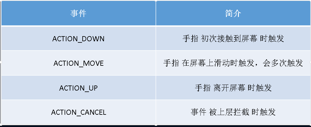 注意:ACTION_MOVE方法会被调用多次,ACTION_CANCEL:当事件被上层拦截时触发,需要掌握拦截的条件