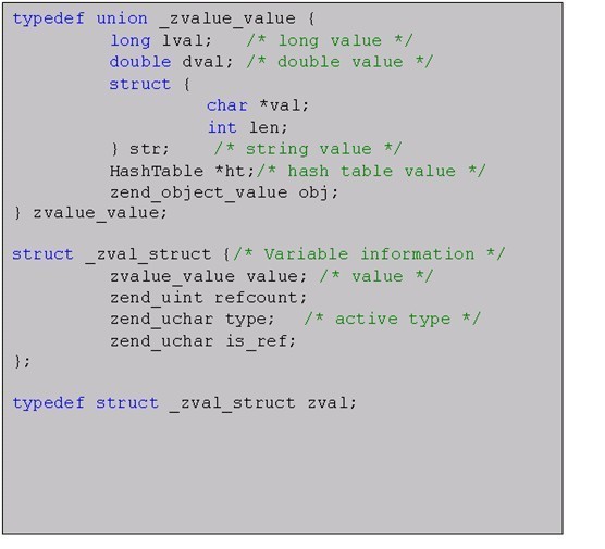Zval是zend中另一个非常重要的数据结构,用来标识并实现PHP变量,其数据结构如下: