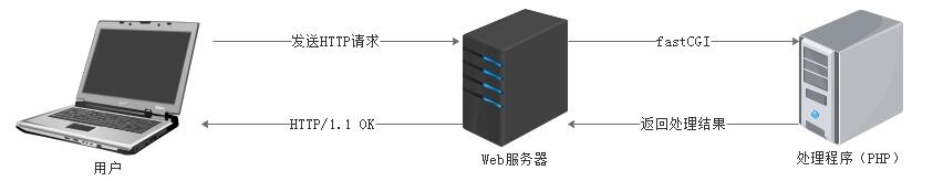 PHP只是一个脚本解析器,在Cli模式下可比较简单,可以直接把命令传递给PHP来处理,但是要处理HTTP请求就没办法直接处理,PHP实现了FastCGI协议,在通过配合Web服务器实现对HTTP的处理,Web服务器来处理HTTP请求,然后将解析后的结果通过FastCGI协议转发给处理程序,处理程序处理完成后将结果返回给Web服务器,Web服务器在返回给用户。如下图