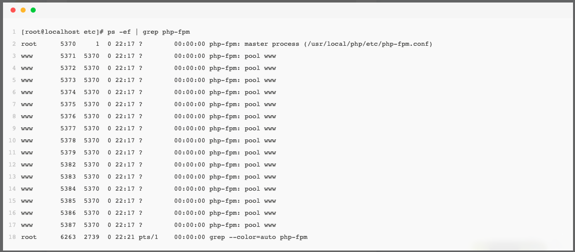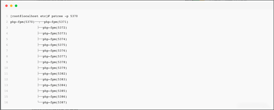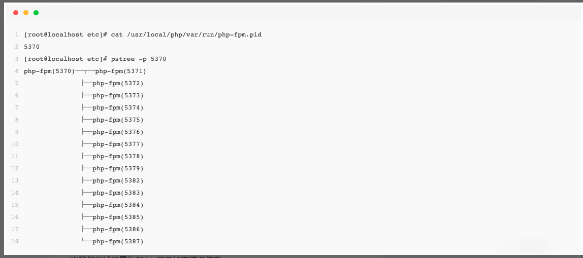 这里的5370则是php-fpm的master进程号。通过上面的命令已经很能直观的得出。