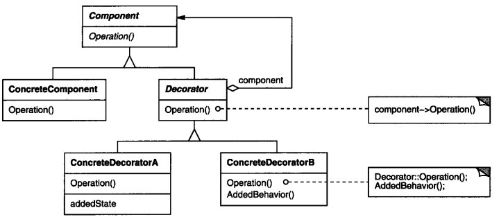 3) decorator与它的component不一样 decorator是一个透明的包装。如果我们从对象标识的观点出发,一个被装饰了的组件与这个组件是有差别的,因此,使用装饰不应该依赖对象标识。