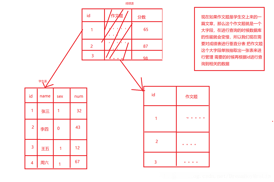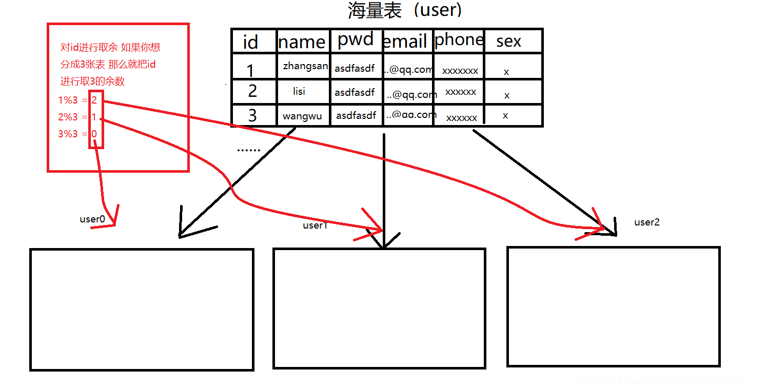 如上图所示:另外三张表表结构是一样的 只不过把数据进行分别存放在这三张表中,如果要insert 或者query 那么都需要对id进行取余 然后table名进行拼接,那么就是一张完整的table_name 但是如果我需要对name进行分表呢 或者对email呢? 那么就需要用MD5进行加密 因为MD5加密后是16进制 那么就就可以进行取余,思路同上。 垂直分表: 为什么需要进行垂直分表? 因为如果一张表中 有一个大字段 而且并不是必须要展示的或者不是当前需要用的 那么虽然没有刻意去查询 但是在根据id或者其他索引进行查询的时候就会把大字段一起查出来,会严重影响查询的性能,所以才有的垂直分表
