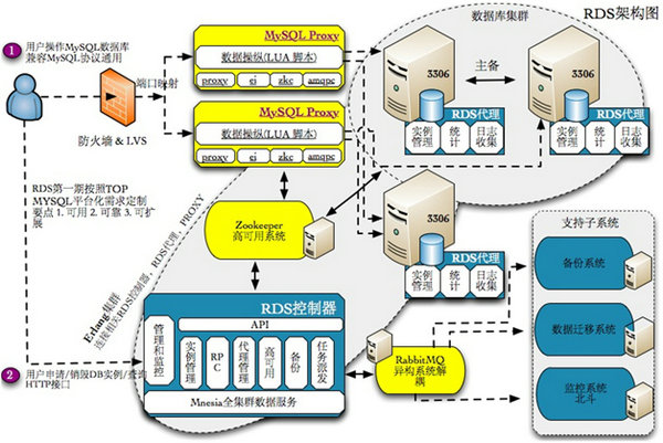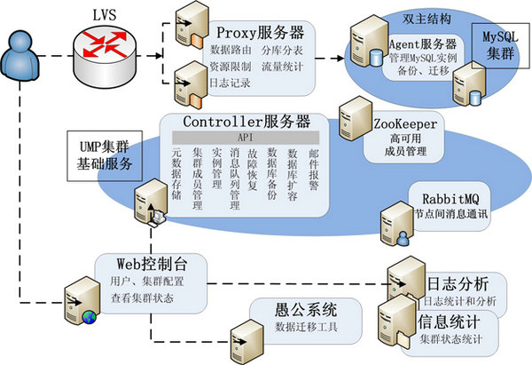 UMP系统中的角色包括:Controller服务器、Proxy服务器、Agent服务器、API/Web服务器、日志分析服务器和信息统计服务器。图3是当前UMP系统的架构图。UMP系统依赖Mnesia、LVS、RabbitMQ、ZooKeeper等开源组件。