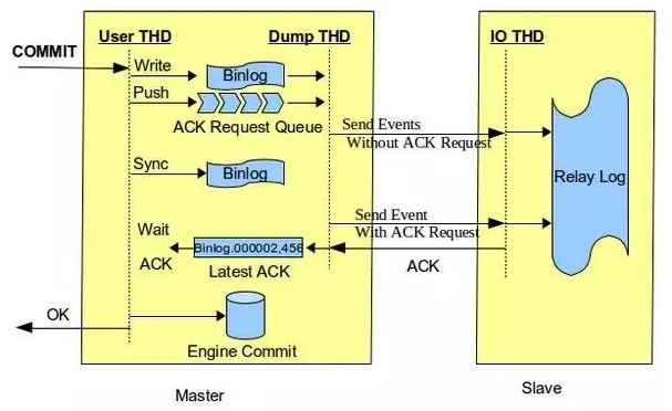半同步复制我们今天谈论第二种架构。我们知道,普通的replication,即mysql的异步复制,依靠mysql二进制日志也即binary log进行数据复制。比如两台机器,一台主机(master),另外一台是从机(slave)。