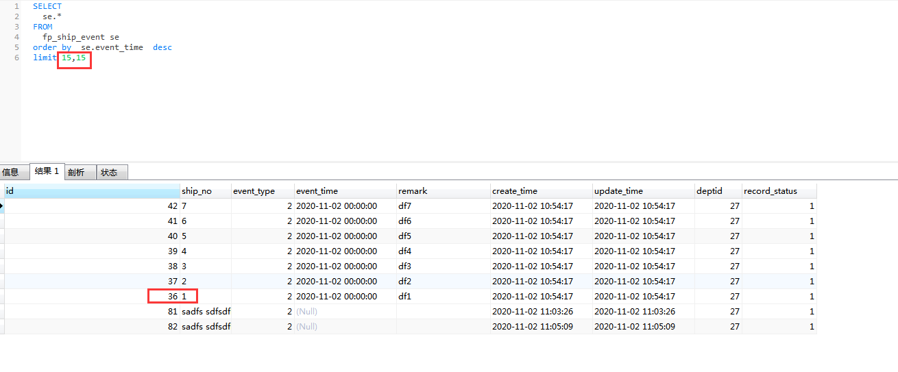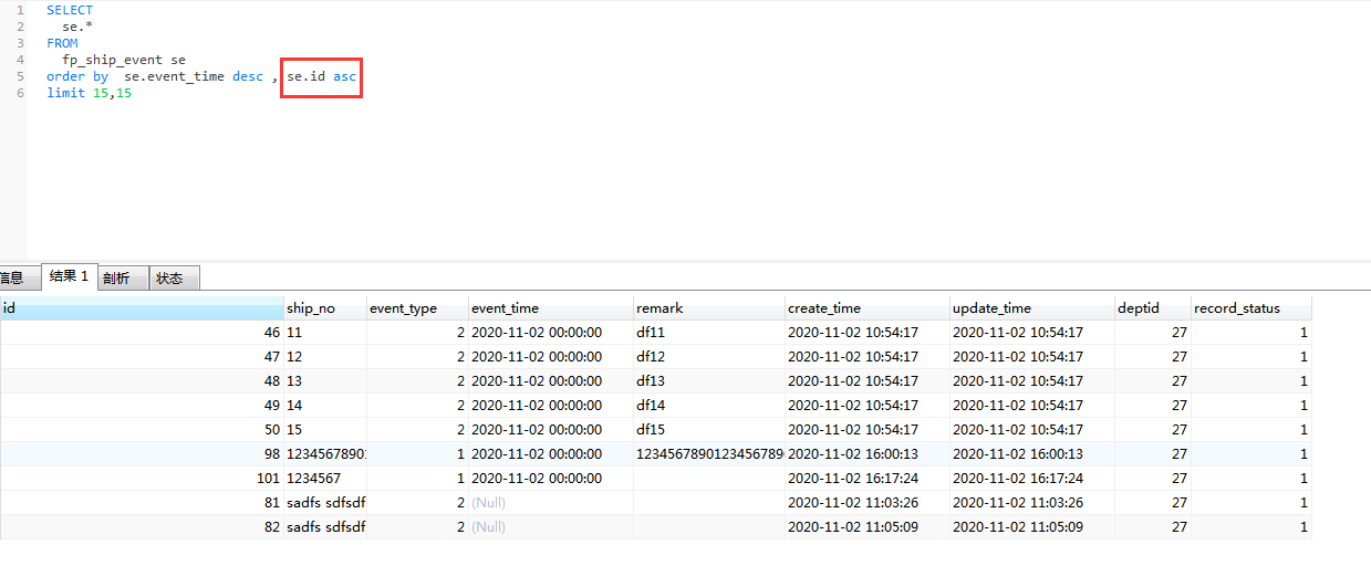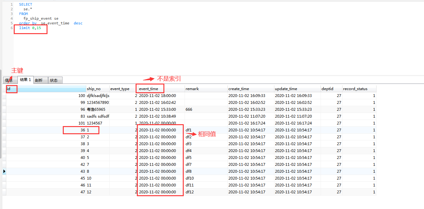 如上以页大小15、按发生时间event_time(不是索字段)倒序进行分页查询,第一页与第二页查询中出现大量重复记录,由此可证。