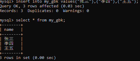 insert into my_gbk values(“张三”),(“李四”),(“王五”);