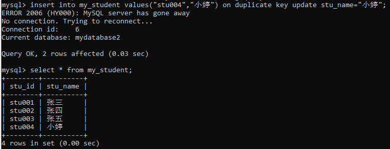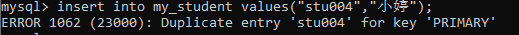 insert into my_student values(“stu004”,“小婷”) on duplicate key update stu_name=“小婷”;