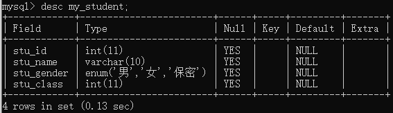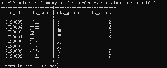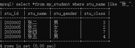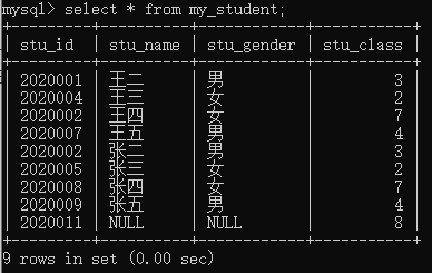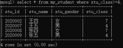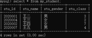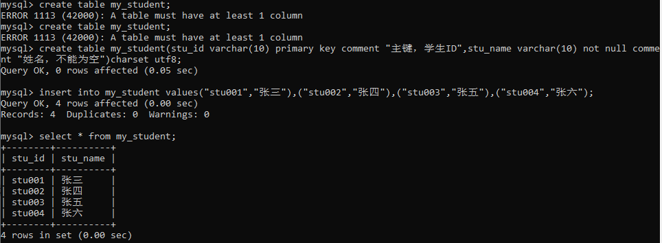 insert into my_student values(“stu001”,“张三”),(“stu002”,“张四”),(“stu003”,“张五”),(“stu004”,“张六”);