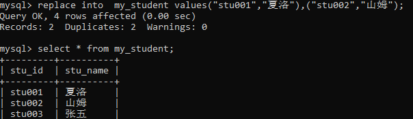 replace into my_student values(“stu001”,“夏洛”),(“stu002”,“山姆”);