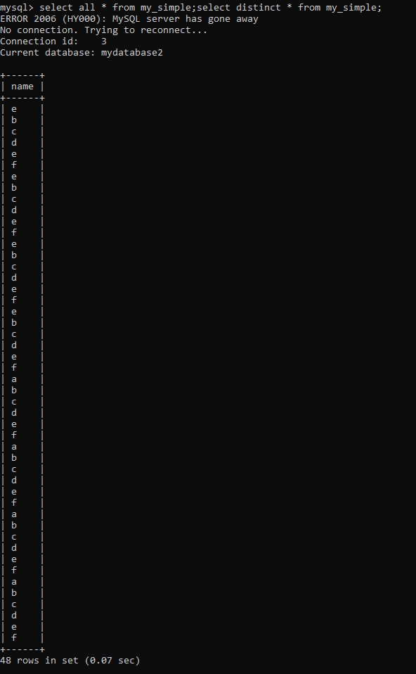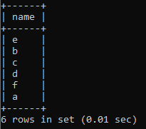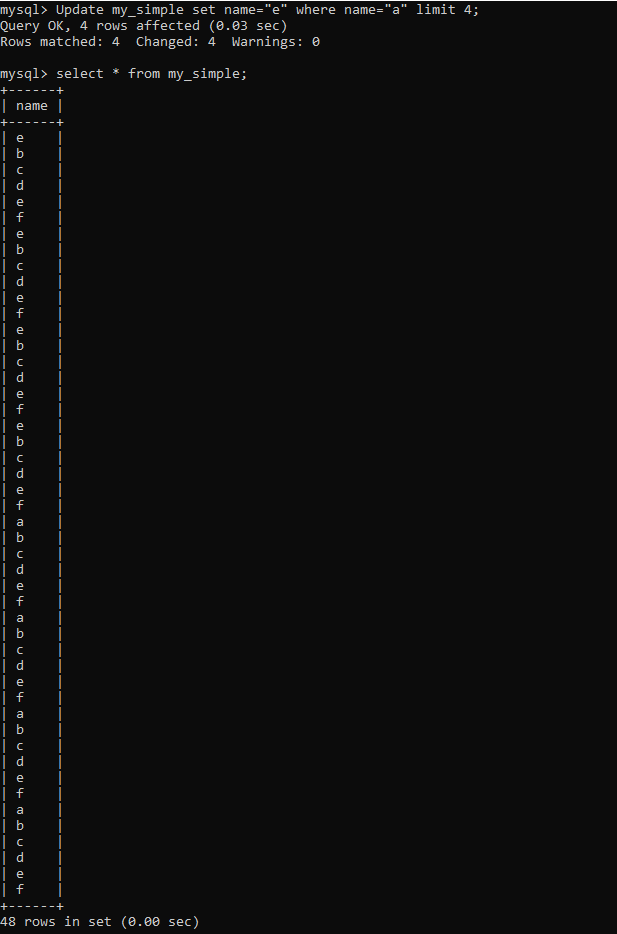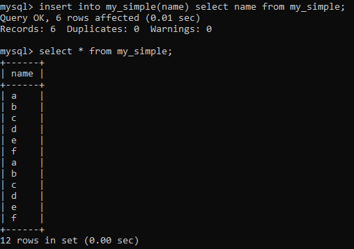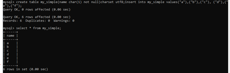 insert into my_simple values(“a”),(“b”),(“c”), (“d”),(“e”),(“f”);