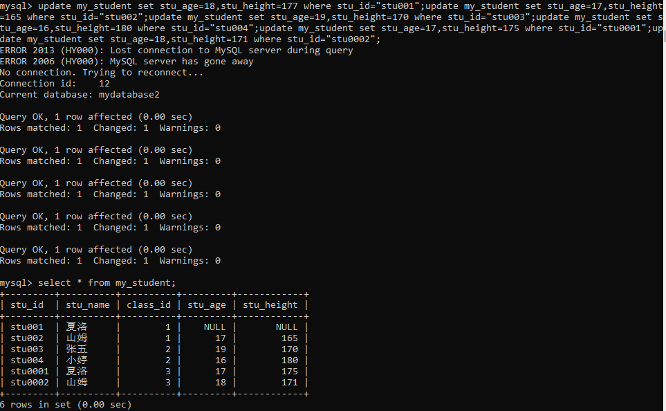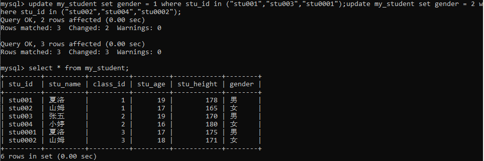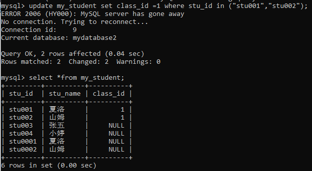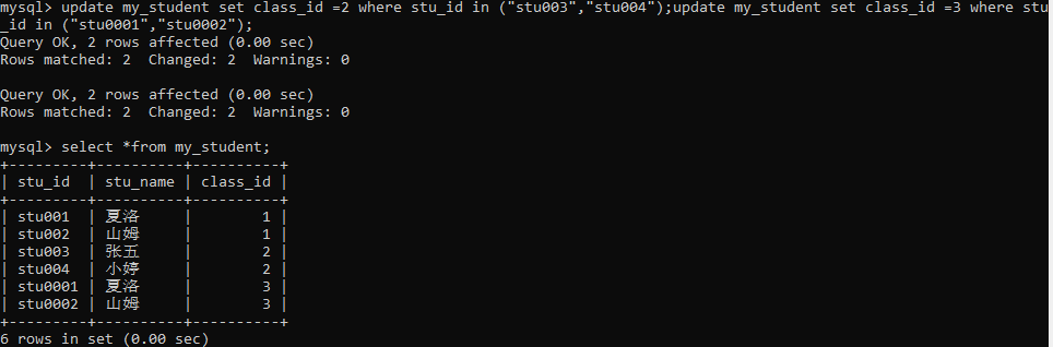 update my_student set class_id =2 where stu_id in (“stu003”,“stu004”);