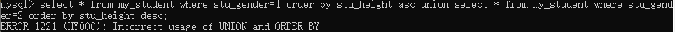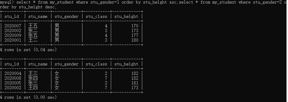 select * from my_student where stu_gender=1 order by stu_height asc union select * from my_student where stu_gender=2 order by stu_height desc;