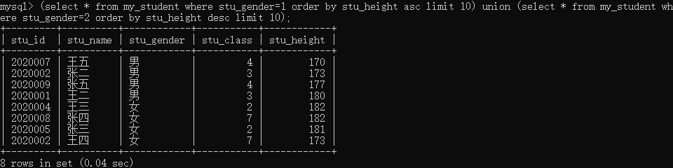 (select * from my_student where stu_gender=1 order by stu_height asc limit 10) union (select * from my_student where stu_gender=2 order by stu_height desc limit 10);