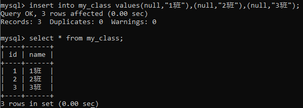 insert into my_class values(null,“1班”),(null,“2班”),(null,“3班”);