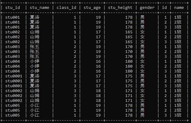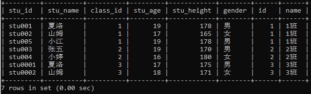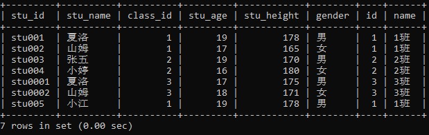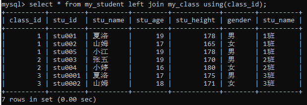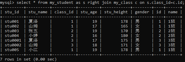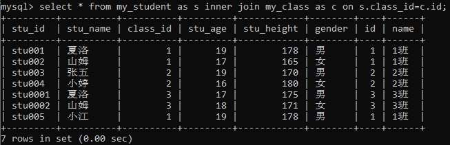select * from my_student as s inner join my_class as c on s.class_id=c.id;