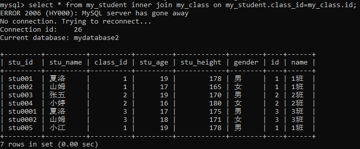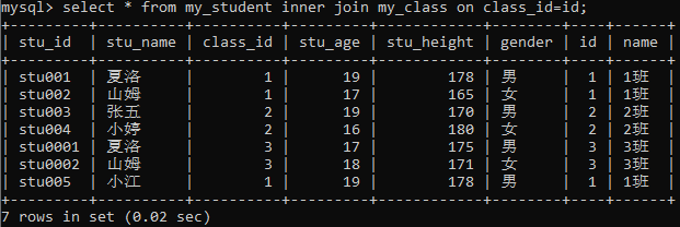 select * from my_student inner join my_class on my_student.class_id=my_class.id;