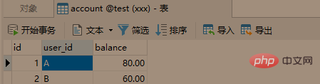 INSERT INTO `test`.`account` (`id`, `user_id`, `balance`) VALUES (1, 'A', 80.00); INSERT INTO `test`.`account` (`id`, `user_id`, `balance`) VALUES (2, 'B', 60.00);