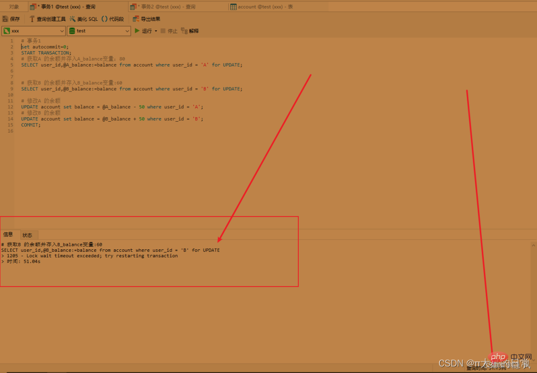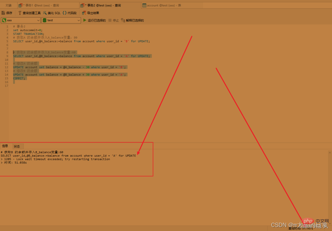 # 获取B 的余额并存入B_balance变量:60 SELECT user_id,@B_balance:=balance from account where user_id = 'B' for UPDATE; # 修改A 的余额 UPDATE account set balance = @A_balance - 50 where user_id = 'A'; # 修改B 的余额 UPDATE account set balance = @B_balance + 50 where user_id = 'B'; COMMIT;