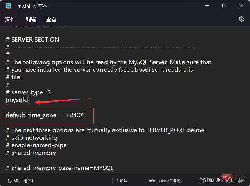 永久的修改:修改mysql的配置文件my.ini,添加:default-time-zone=’+08:00’,重启mysql生效,注意一定要在 [mysqld] 之下加 ,否则会出现 unknown variable ‘default-time-zone=+8:00’