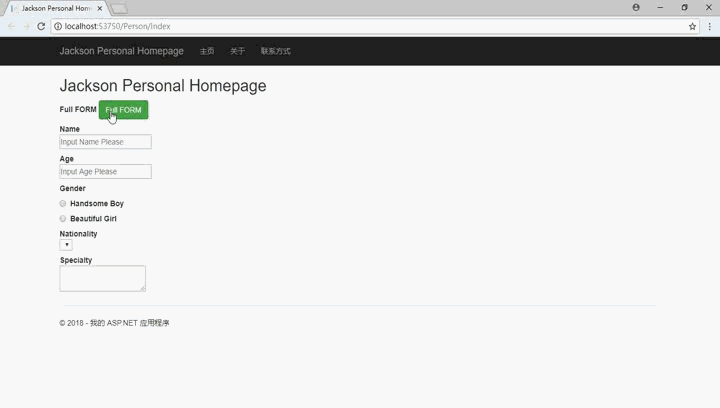 通过控制器创建一个index视图,写入下列html代码,这里我创建了一个分部视图,不创建直接写在同一个页面也是一样的效果。为了更加直观的显示数据传递时的页面变化我就不将分部视图外的“div”标签增加“hidden”属性。在正常的情况下,我们需要将原先页面分部视图中的form表单隐藏掉,因为使用了bootbox,在点击“full form”按钮时会自动生成一个模态框,里面克隆了表单内的所有元素内容。